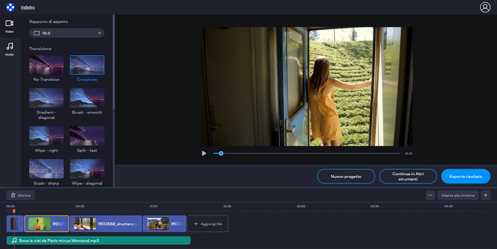 Lo strumento online di Movavi per unire video online consente di combinare più clip senza installare software. È intuitivo e ti permette di creare un unico progetto in pochi clic, pronto per l’uso. Puoi utilizzare il servizio gratis e ottenere rapidamente il video finale.