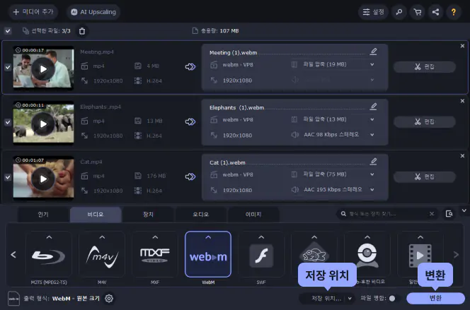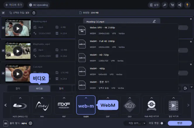 WebM은 HTML5 표준에 의해 지원되는 세 가지 형식 중 하나이므로, AVI, WMV 또는 MOV 비디오를 웹 페이지에 포함시키려면, 비디오를 WebM으로 변환해야 할 수 있습니다. 하지만 대부분의 모바일 기기는 이 형식을 지원하지 않습니다. 휴대폰이나 태블릿, 미디어 플레이어에서 WebM 비디오를 보려면 보다 기기에 적합한 형식(예: WebM MP4 변환)으로 변환해야 합니다. 어떤 경우든지, 뛰어난 WebM 변환기가 필요할 것입니다.