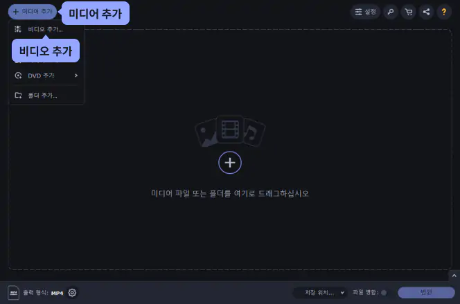 프로그램 창의 왼쪽 상단에서 미디어 추가를 클릭한 후 비디오 추가를 선택하고 변환하려는 파일을 엽니다. 이 프로그램은 배치 변환 기능을 통해 여러 파일을 동시에 처리할 수 있으므로, 한 번에 여러 비디오를 추가할 수 있습니다.