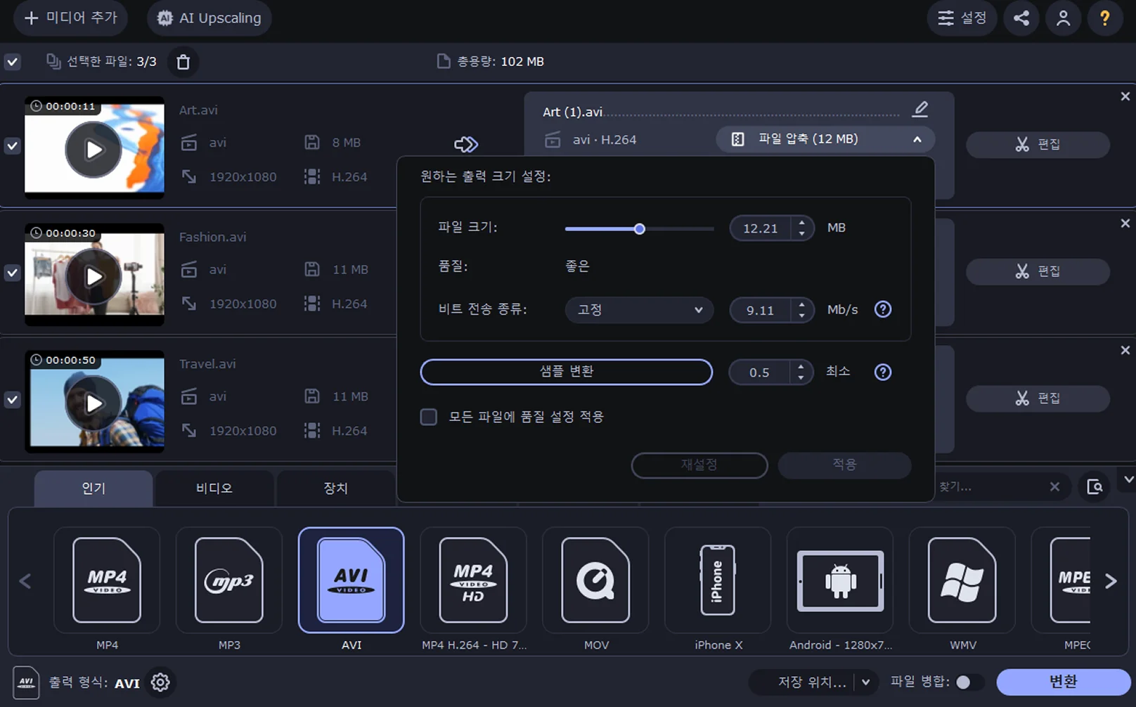 하단의 출력 형식 탭에서 원하는 비디오 형식(AVI, MP4, MOV 등)을 선택합니다. 파일 크기 슬라이더를 조정하면 예상 출력 용량을 미리 확인할 수 있으며, 해상도와 비트레이트를 수동으로 변경하여 화질과 용량의 균형을 설정할 수도 있습니다.