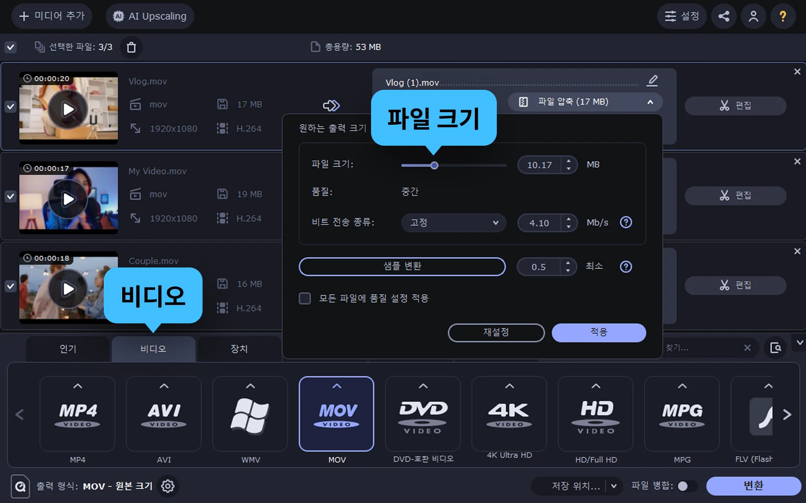 MOV 압축을 위해 하단의 출력 형식 탭에서 원하는 비디오 형식(MOV, MP4 등)을 선택합니다. 필요에 따라 해상도, 비트레이트, 프레임 레이트 등 세부 항목을 슬라이더를 조정하거나, 해상도와 비트레이트를 변경하여 원하는 용량으로 설정합니다.