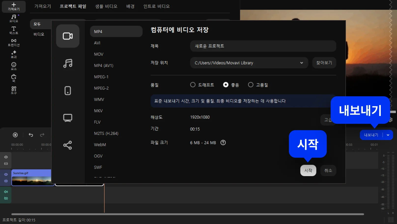 *무료 버전의 Movavi Video Editor는 빌드에 따라 다음과 같은 제한 사항이 있을 수 있습니다. 내보낸 클립에 표시되는 워터마크, 60초 비디오 또는 1/2 오디오 길이 제한 및/또는 비디오를 내보낼 때 일부 고급 기능 사용 불가