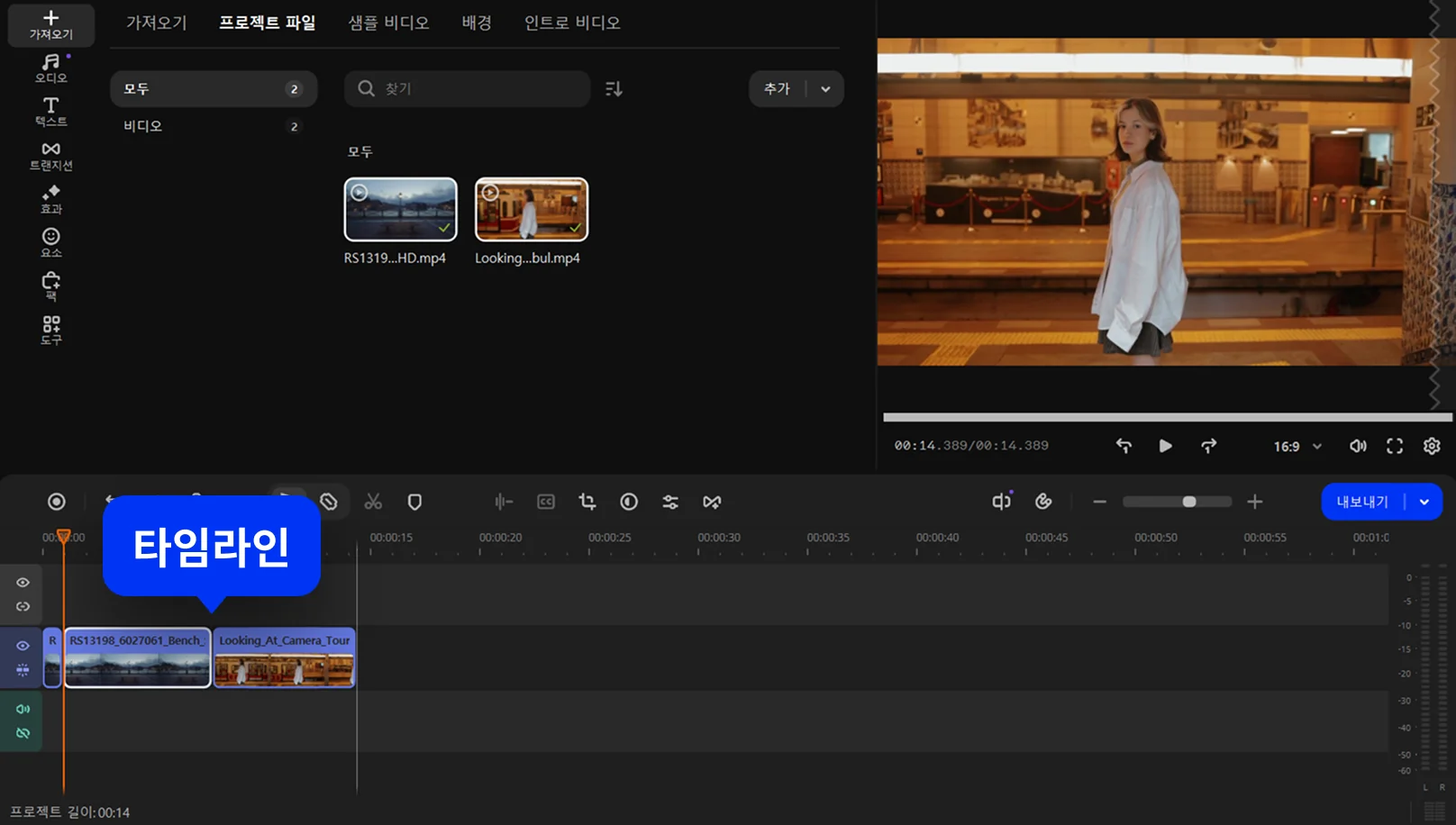 타임라인의 파일 추가 버튼을 클릭하여 기존 타임라인의 파일과 병합할 파일을 불러온 다음 나란히 배치합니다.