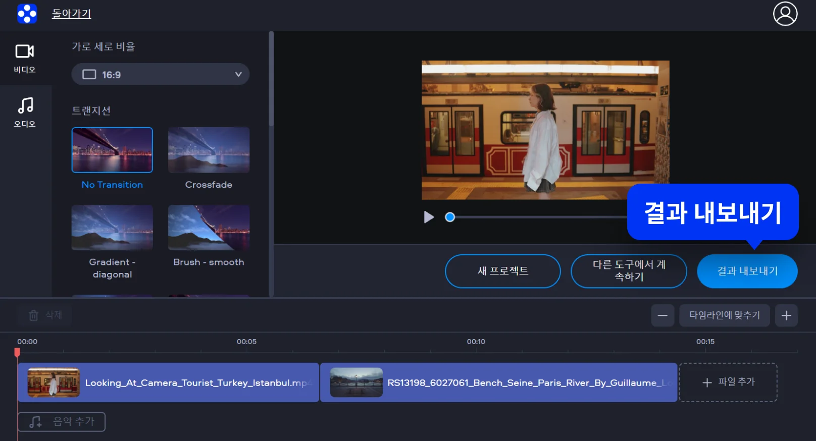 타임라인에 영상을 배치하고 필요할 경우 위치를 재조정합니다. 원하지 않는 부분은 잘라낼 수 있으며 미리보기에서 얼마나 영상이 매끄럽게 연결되는지 확인할 수 있습니다.