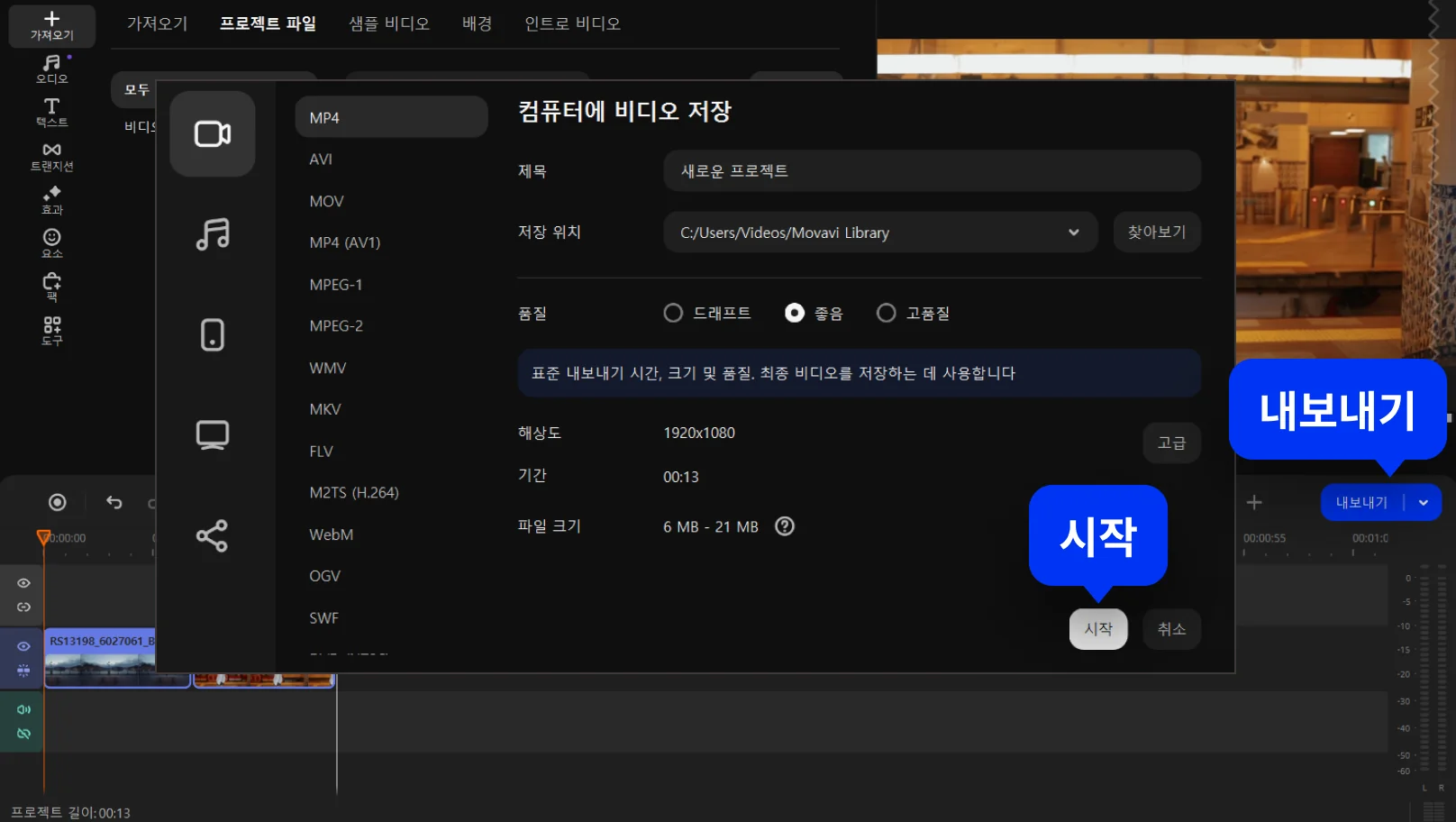 MP4 병합한 파일을 내보내기 옵션 중 한 가지를 선택하여 영상을 다운로드합니다.