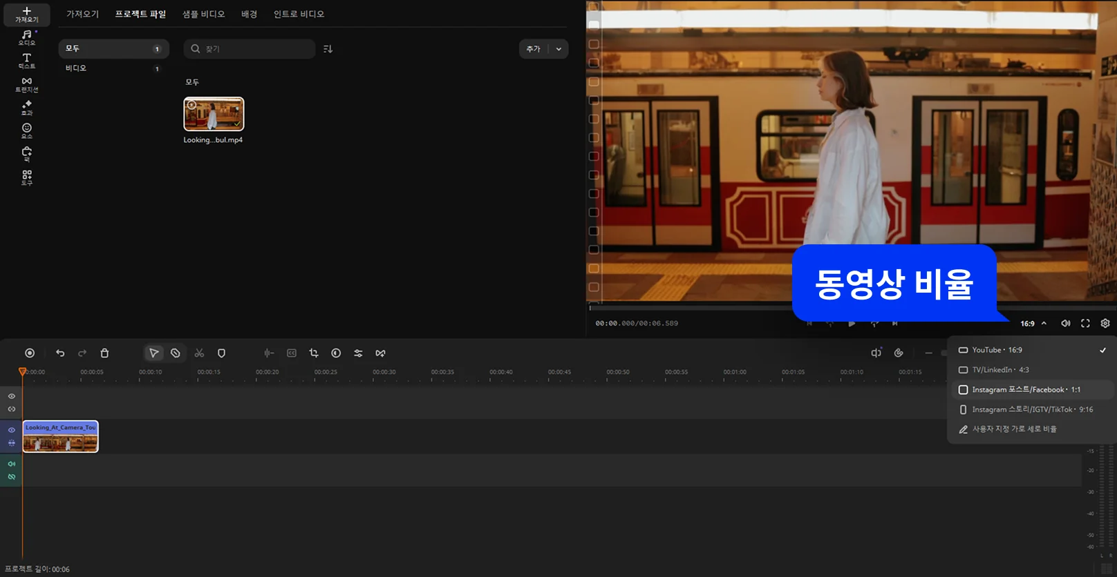 편집 화면에서 프리셋 비율을 적용해 동영상 크기 조절을 수행합니다.