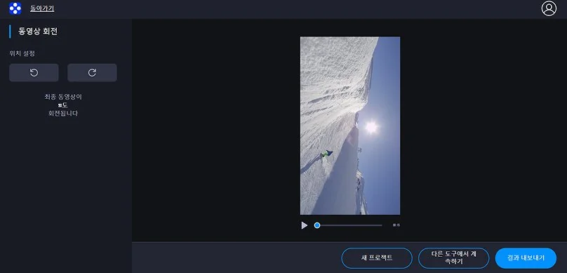 편집 화면에서 회전 아이콘을 클릭해 동영상 방향 돌리기를 적용합니다. 클릭할 때마다 90도씩 회전하며, 원하는 방향이 나올 때까지 반복할 수 있습니다. 이 과정에서 동영상 90도 회전이 즉시 화면에 반영됩니다.