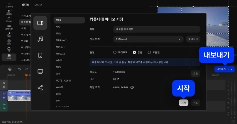 올바른 방향이 설정되면 내보내기 버튼을 클릭합니다. 새 창에서 MP4, MOV, MKV, AVI 등 다양한 형식을 선택할 수 있습니다. 저장 위치를 지정한 뒤 시작 버튼을 클릭하면 회전된 비디오가 저장됩니다.