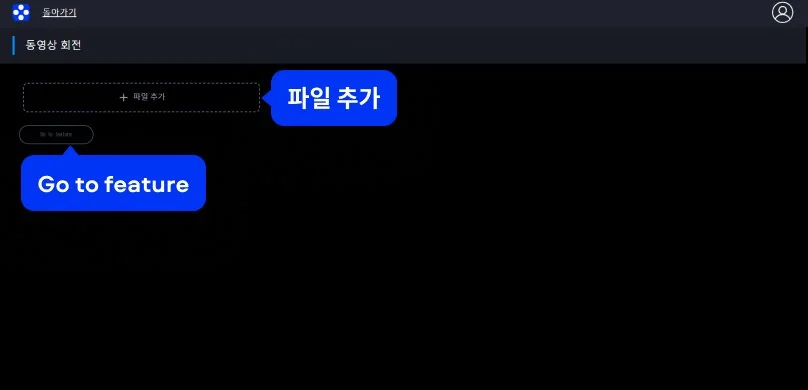 페이지에서 파일 업로드 버튼을 클릭해 회전할 비디오 파일을 선택합니다. 파일이 업로드되면 Go to feature 버튼을 눌러 편집 화면으로 이동합니다.