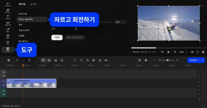 상단 메뉴에서 도구 > 자르고 회전하기를 엽니다. 타임라인에서 원하는 비디오 클립을 클릭해 선택한 후 회전 버튼을 눌러 비디오를 90도씩 회전합니다. 원하는 방향이 나올 때까지 반복해 조정할 수 있습니다.