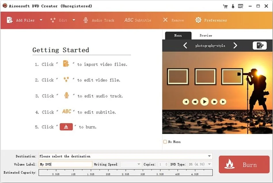 Aiseesoft DVD Creator will appeal to anyone craving for high-quality DVD production without stress. It handles AVI, MP4, MOV, and dozens more. Plus, it supports DVD-R/RW, DVD+R/RW, and even Blu-ray burning. Customizable menus, multiple audio tracks, and subtitle options give projects a personal touch. The editor lets you tweak brightness, crop, trim, and watermark your videos before burning. Hardware acceleration ensures DVD creation runs like a dream.