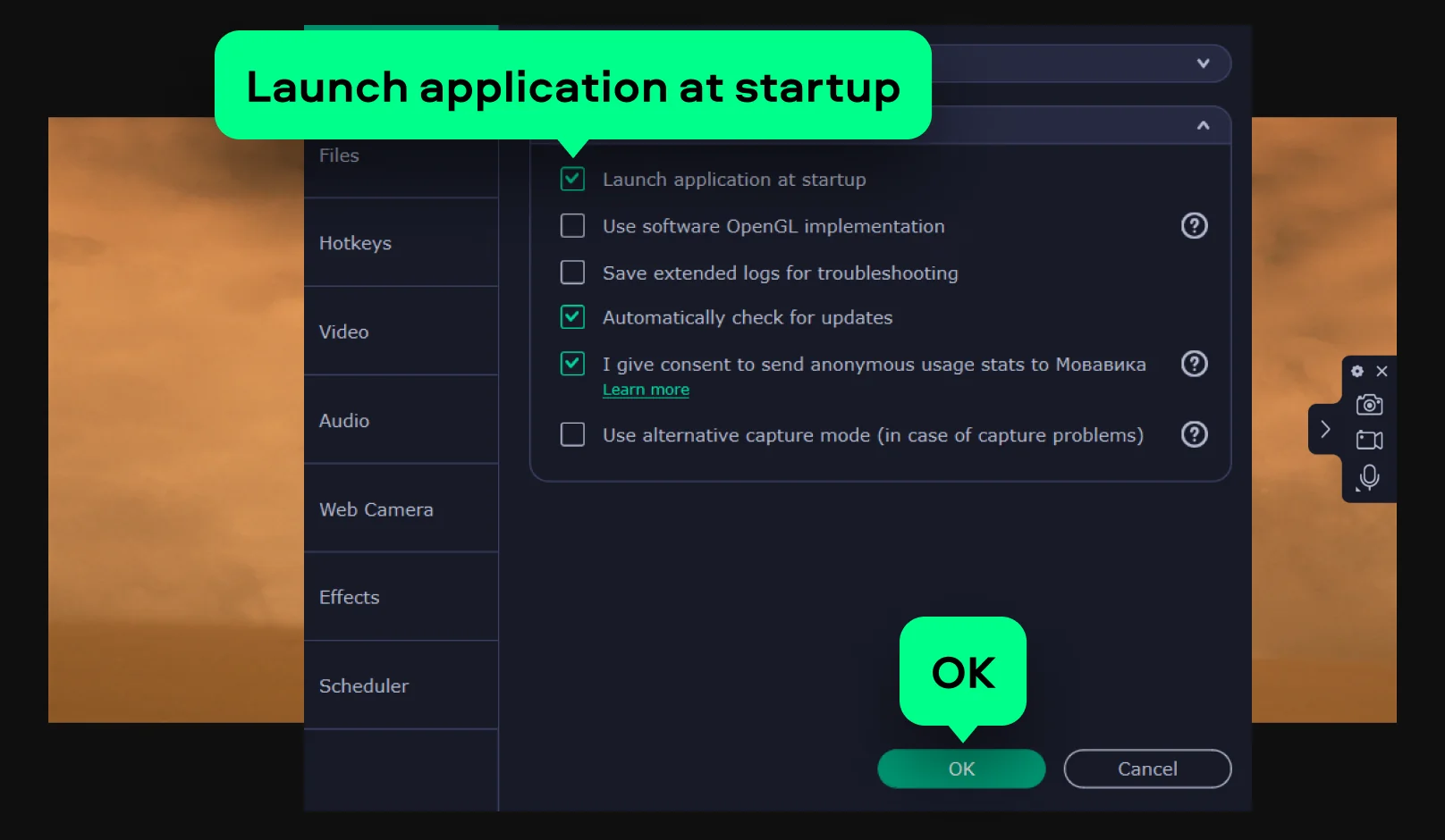 Make sure your computer is on and the screen recorder is running at the scheduled time. To avoid missing the start, enable the app to launch when your computer starts up. Open Preferences, go to General, click More, and check Launch application at startup.