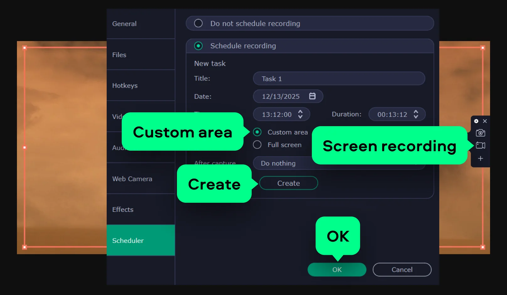 By default, the program records your entire screen. If you want to capture only part of it, select the Custom area option – the recorder will use the last area you selected. Then click Create, followed by OK – your recording will start at the scheduled time.