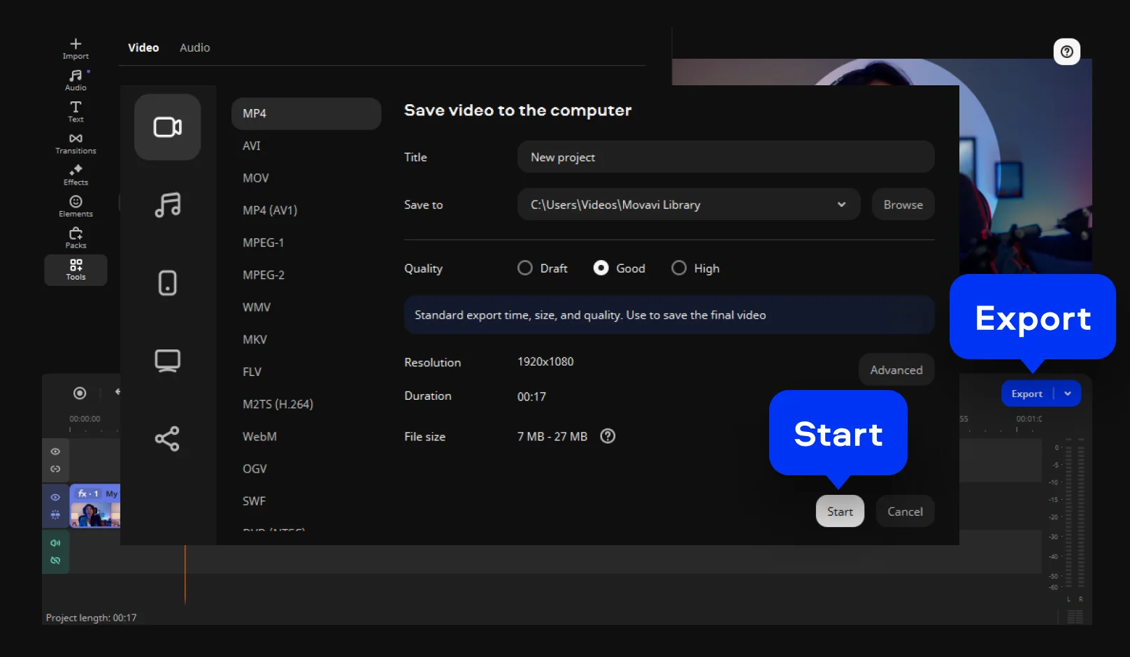 *The free version of Movavi Video Editor may have the following restrictions depending on the build: watermark on exported clips, 60-second video or 1/2 audio length limit, and/or some advanced features unavailable when exporting videos.
