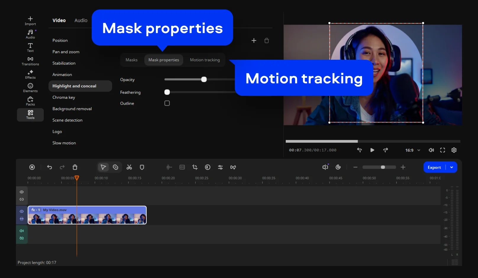 Here, you can adjust the mask's edges by moving the slider for the feathering option, as well as its opacity. If you need the mask to move along with the subject, you can move over to the Motion tracking tab.