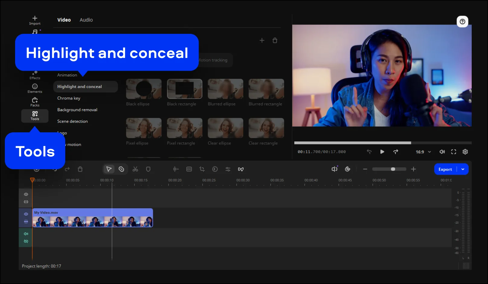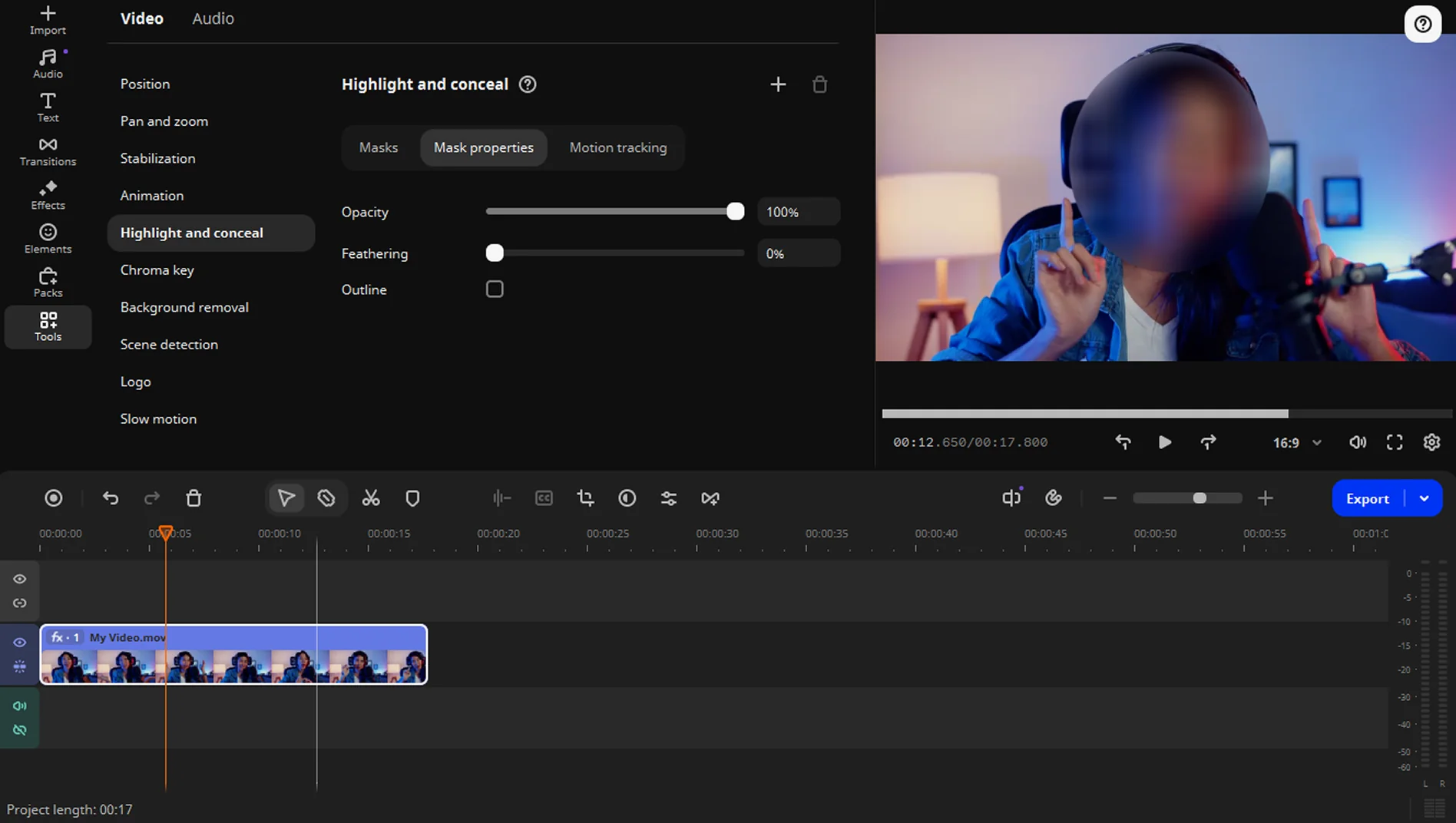 Finally, but crucially, you’ll need video-editing software that includes video masking features. All professional editing suites have masking capabilities. However, if you’re just starting out with masking videos, using a simple video masking software like Movavi Video Editor is going to help you learn the ropes quickly and easily. This program includes pre-set masks in different shapes. You can instantly use these with blurring, pixelated, or solid backgrounds to either highlight or conceal parts of your footage. You can also leverage machine learning by using the AI-powered motion tool to track objects and create dynamic masks for them.
