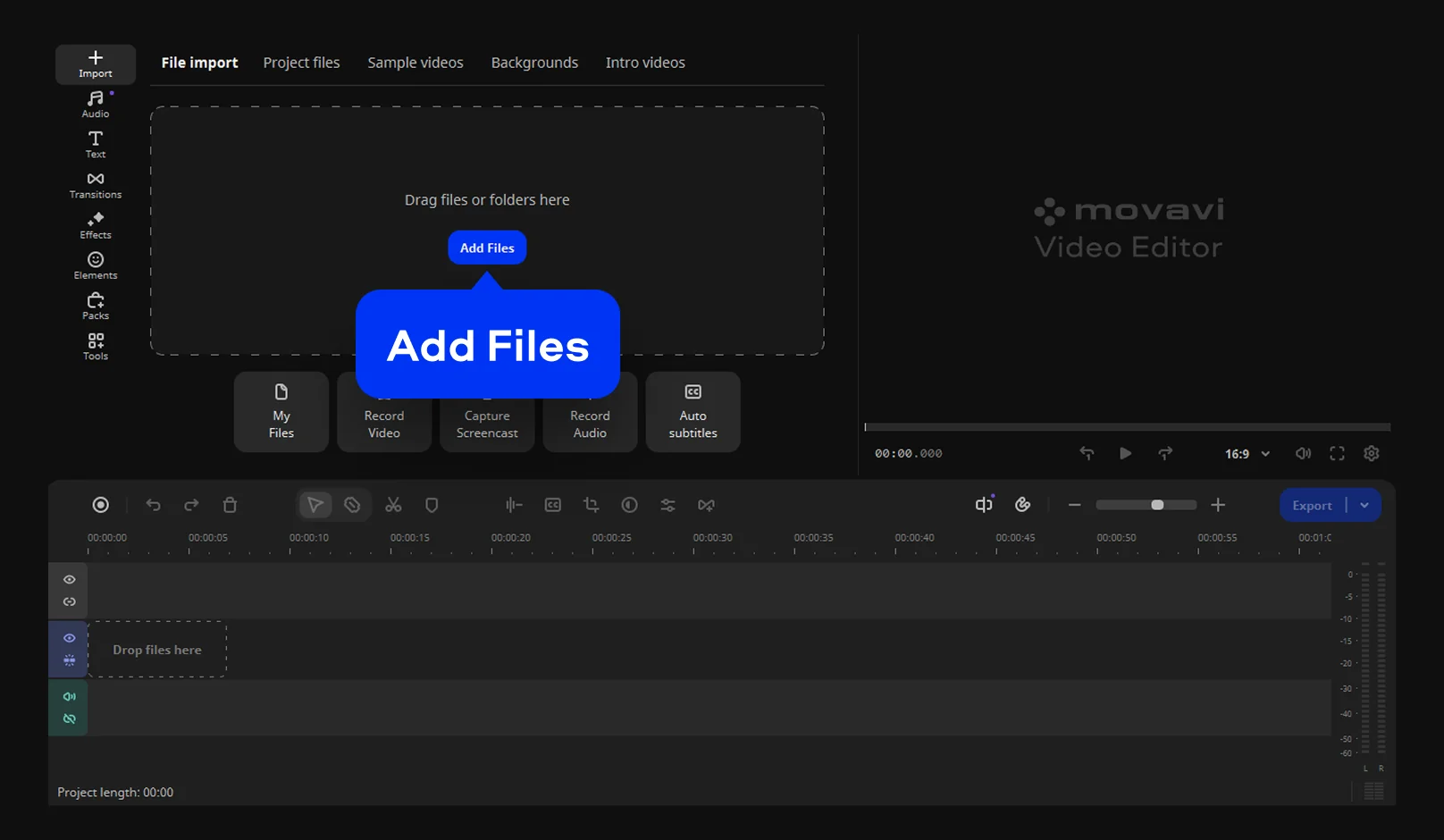 Click Add Files and locate videos you want to edit. Drag and drop them onto the timeline.