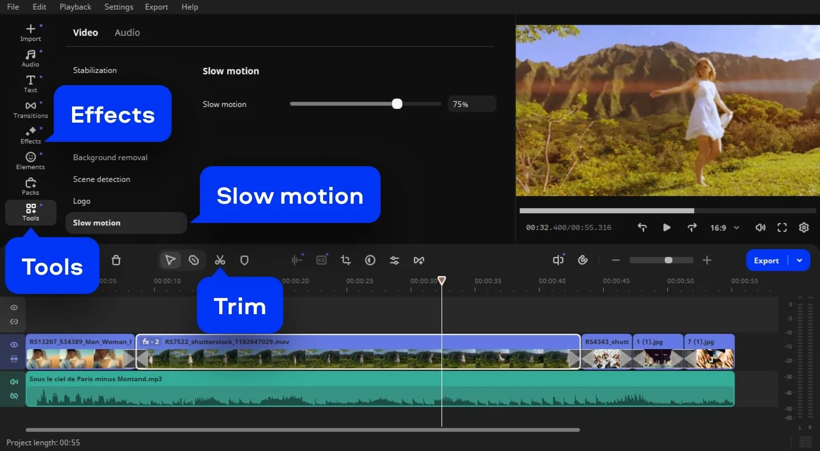 - Use tools to correct light, stabilize shaky clips, balance audio levels.