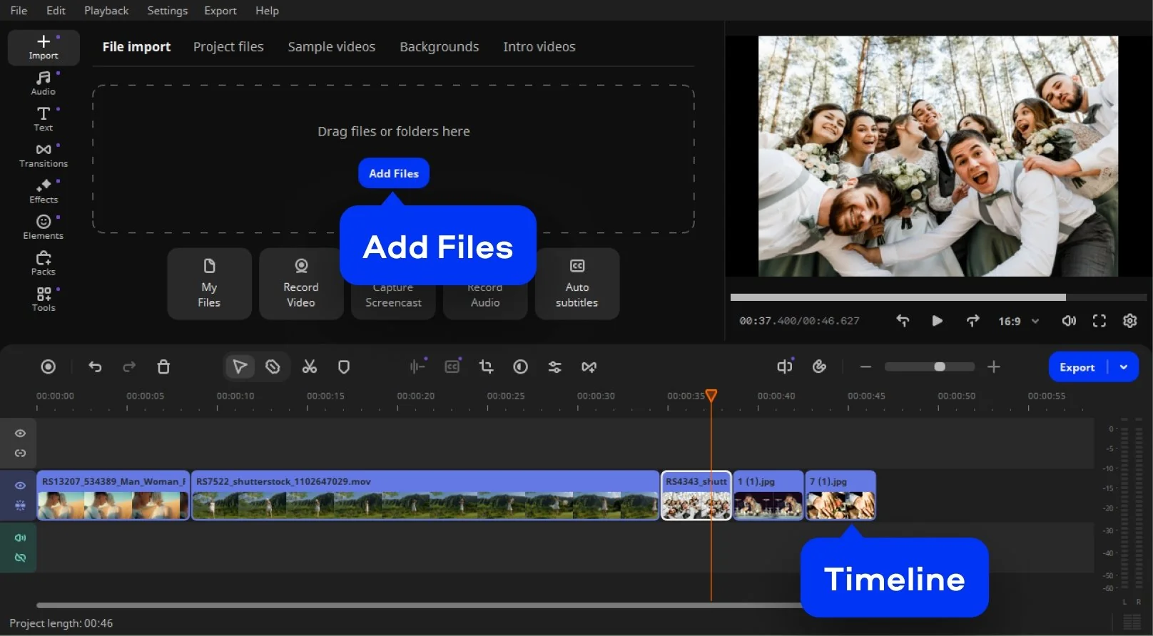 Click the Add Files button and select the files you want to use in the video. Next, drag your media files to the Timeline at the bottom part of the program window.