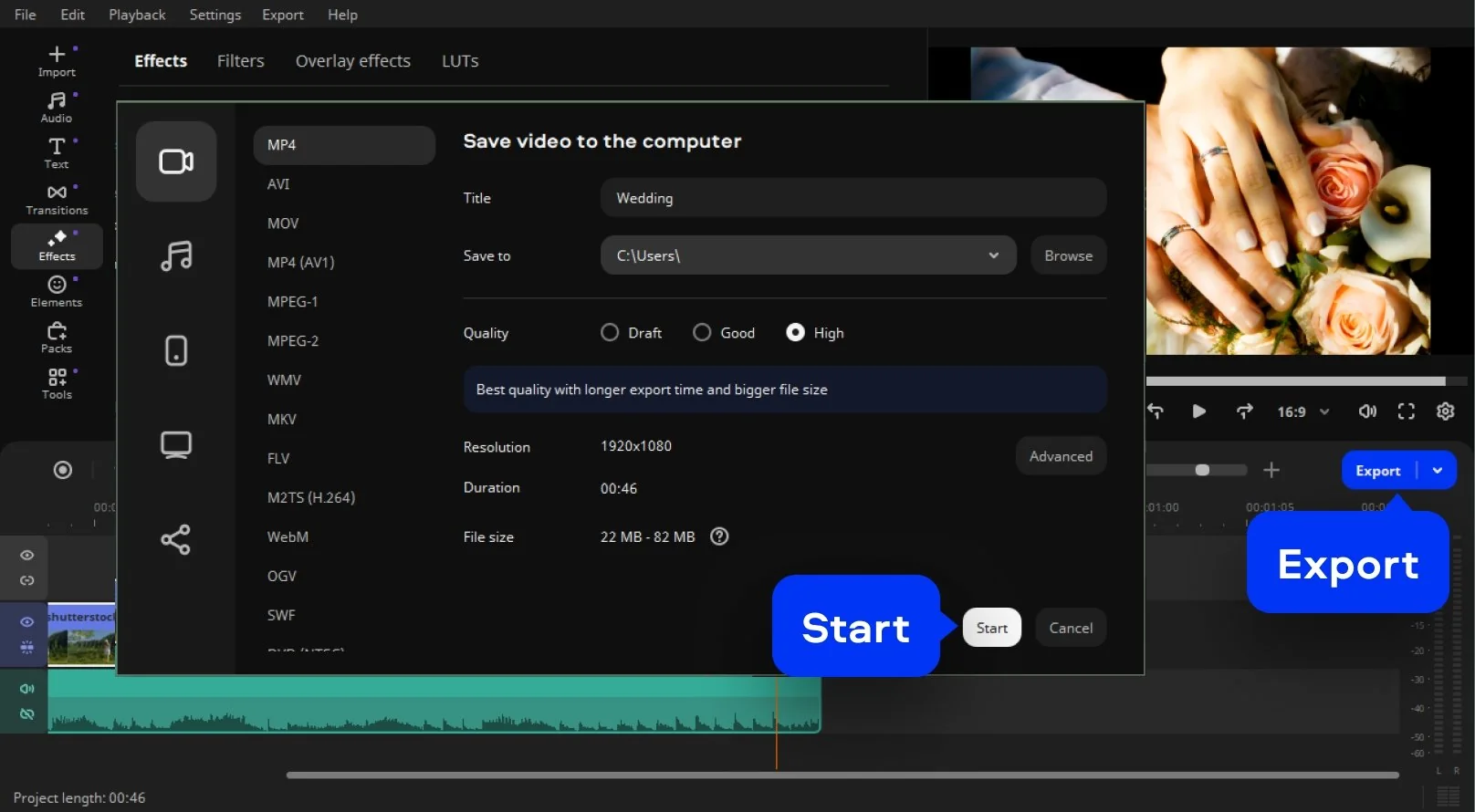 Trim the edges, balance the light, soften the sound. Play with filters, slow down a smile, fade into a kiss. Movavi Wedding Video Editor gives you tools that feel like brushes in your hands – intuitive and delicate.