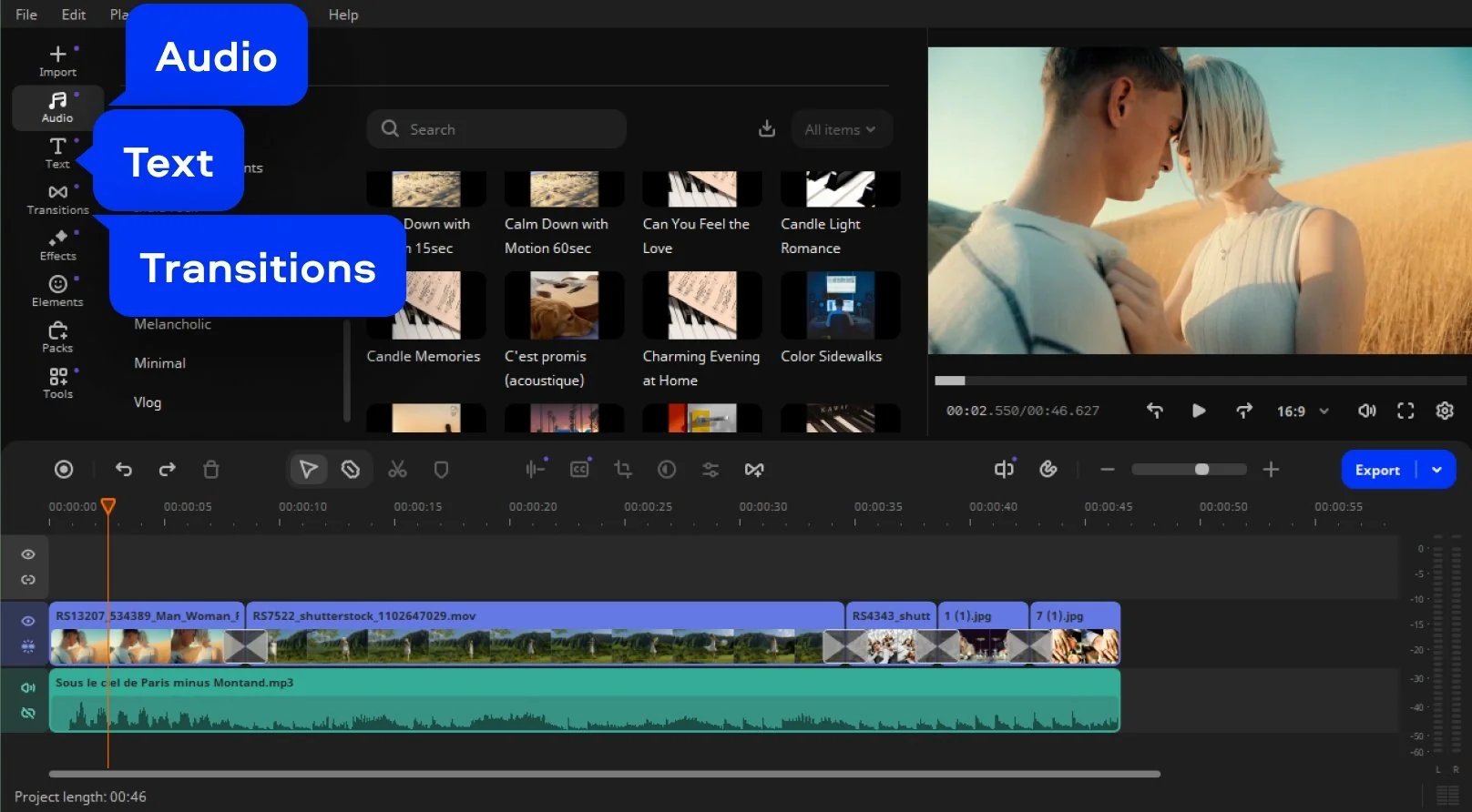 Open the Transitions and Text tabs and drag elements into your project. Let the music join – choose a song that still makes your heart skip. You can import your own or pick from Movavi’s library of tender, ready-to-use melodies.