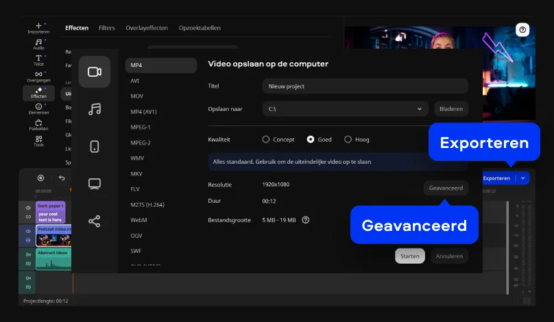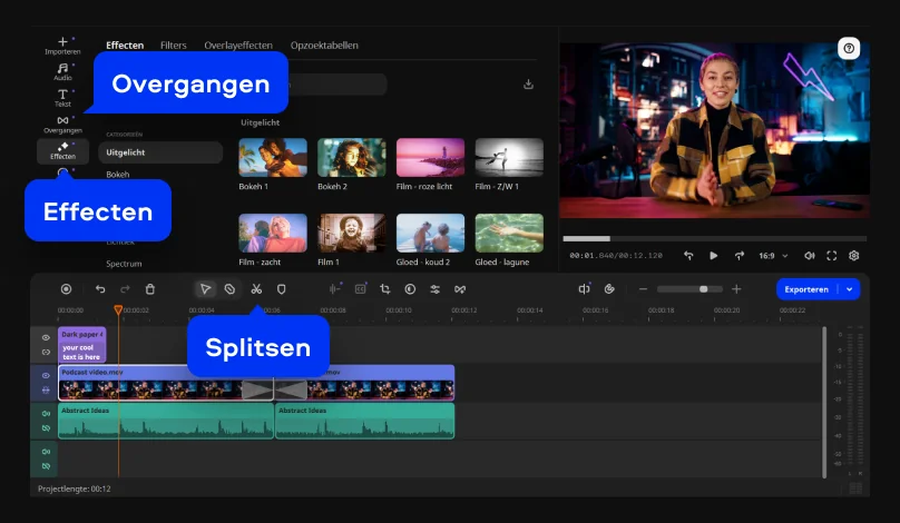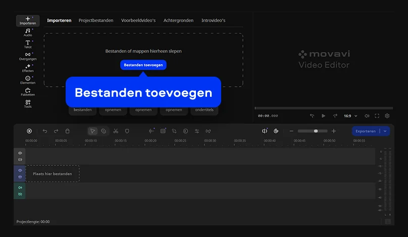 De interface toont duidelijk benoemde tools, met de belangrijkste modi links gegroepeerd, zodat wisselen tussen knippen, effecten en titels logisch aanvoelt. Bestanden importeer je via een knop, een menu of slepen, en de meest gebruikte formaten openen direct binnen dit videobewerkingsprogramma.