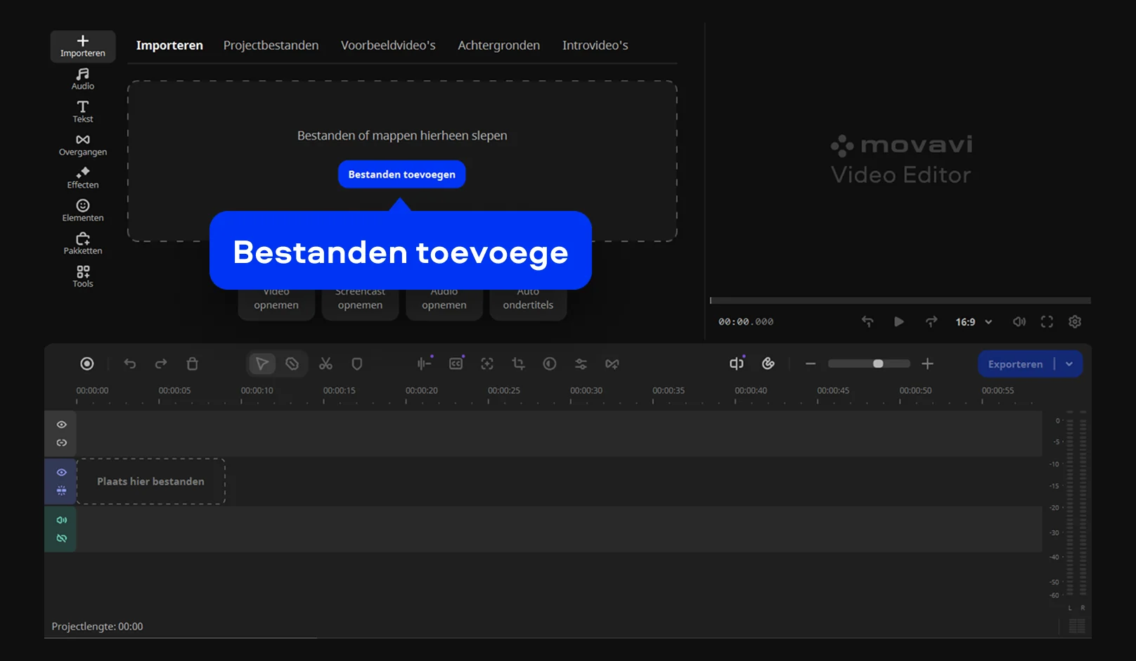 Open Movavi Video Editor en maak een nieuw project aan. Klik op Bestanden toevoegen of sleep je video rechtstreeks naar het programmavenster. Zet het bestand daarna op de tijdlijn onder in het venster. Vanaf dat moment kun je elk deel van de opname apart bewerken.