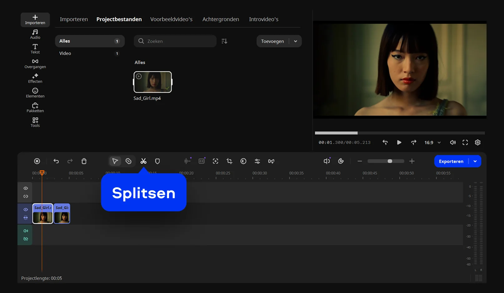 Daarvoor heb je een editor nodig met een tijdlijn of een functie om scènes te splitsen. In Movavi Video Editor plaats je de clip op de tijdlijn en zet je de afspeelkop op de plek waar de video moet worden verdeeld. Klik daarna op Splitsen. De clip wordt meteen in twee aparte delen verdeeld. Daarna kun je elk deel afzonderlijk bewerken, verplaatsen of verwijderen. In de browsertool van Movavi ligt de nadruk vooral op het instellen van één selectie door de randen van het fragment te verschuiven. Wil je echt twee losse bestanden maken, dan is de desktopversie handiger.