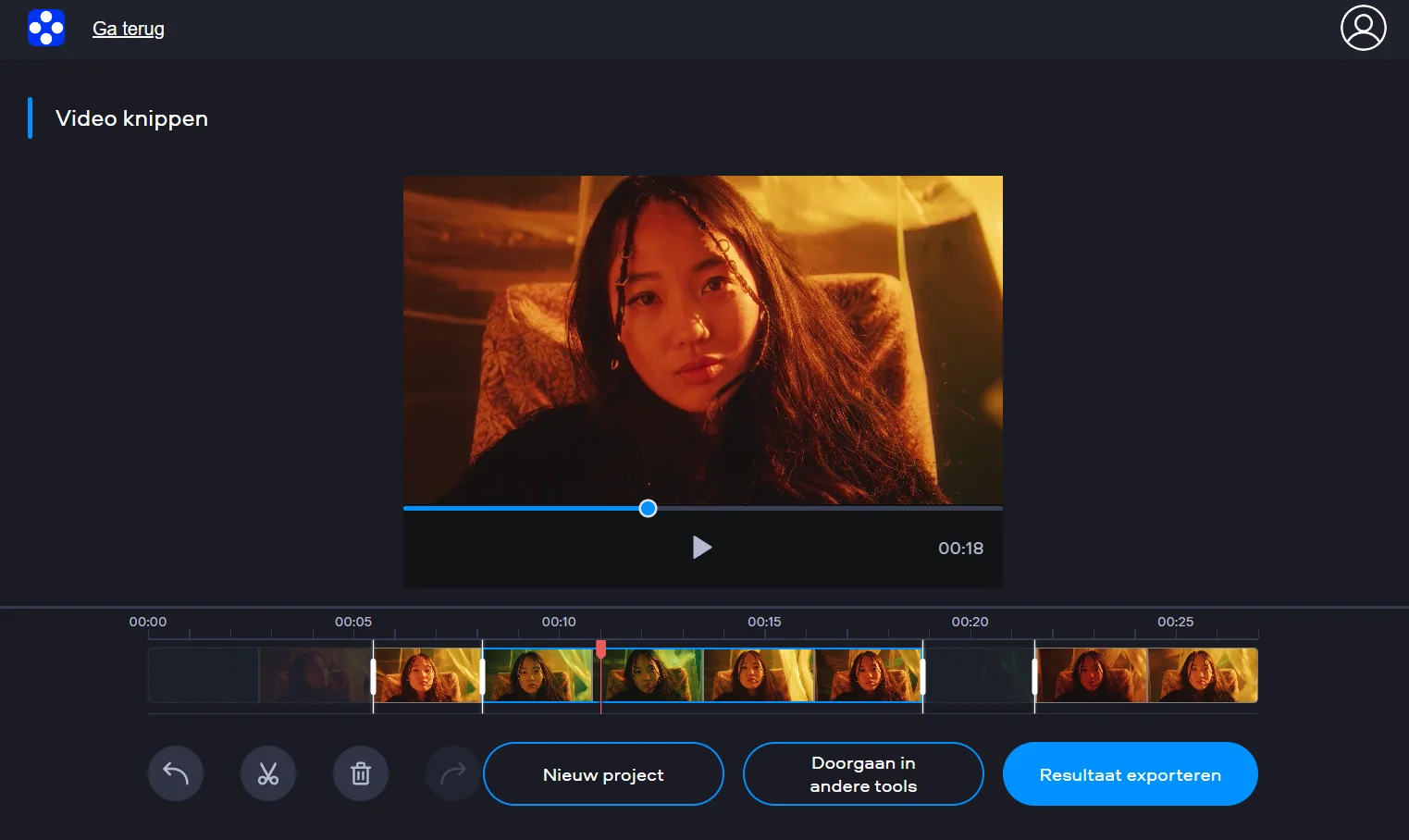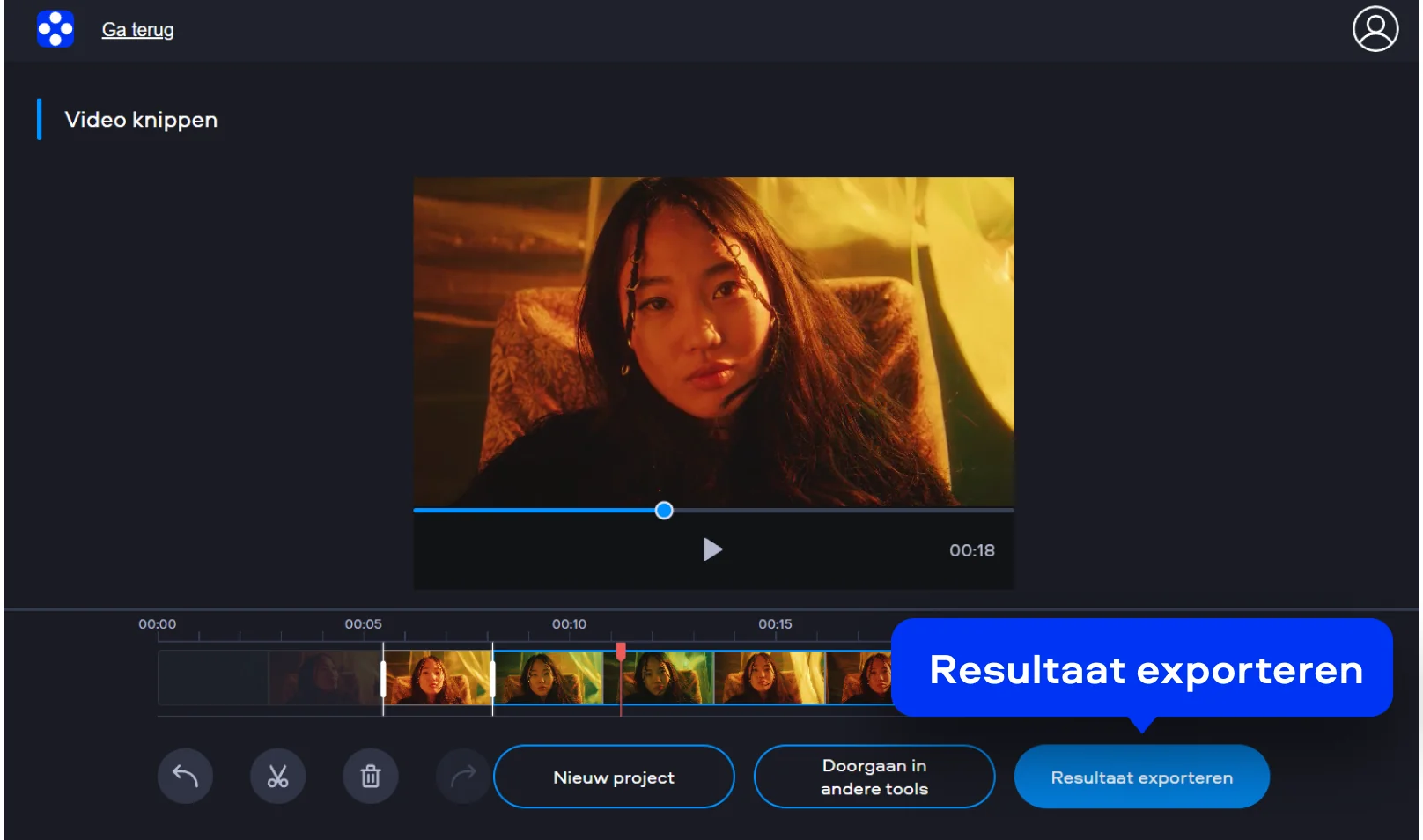 Ben je tevreden met de gekozen selectie, klik dan op Resultaat exporteren. De tool verwerkt alleen het gemarkeerde deel en maakt een nieuwe clip zonder kwaliteitsverlies. Daarna kun je het bestand direct opslaan op je apparaat of verder exporteren voor gebruik in andere projecten of op andere platforms.