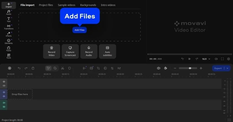 Launch Movavi Video Editor and click on Add Files to upload files you need for the project, then drag them on the Timeline.