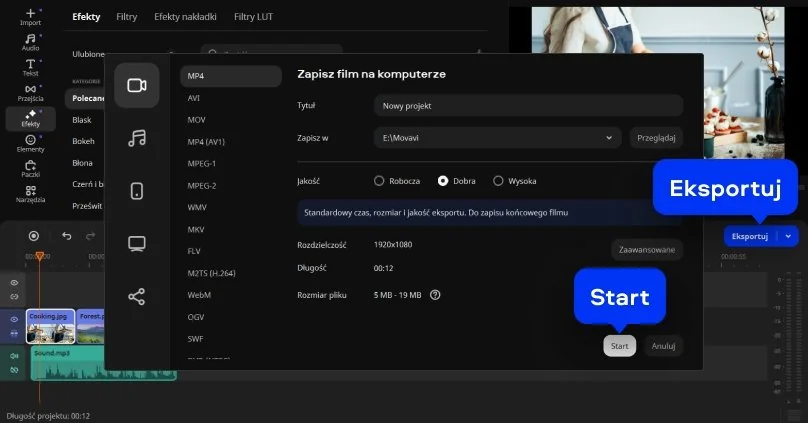 Kliknij przycisk Eksportuj i wprowadź preferowane opcje zapisywania. Możesz zapisać swoją animację w dowolnym popularnym formacie, przygotować ją do przesłania na określone urządzenie lub udostępnić w serwisie YouTube. Aby zapisać film, kliknij przycisk Start.