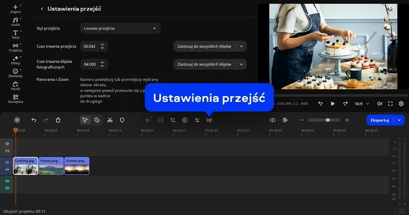 Kliknij Ustawienia przejść i ustaw czas w polu Czas trwania klipów fotograficznych. Aby utworzyć wideo szybkością 24 klatek na sekundę, wpisz w polu 00.042. Aby stworzyć wideo z prędkością 12 klatek na sekundę, wpisz w polu 00.084. Jeśli nie masz wystarczającej liczby zdjęć, wybierz dłuższy czas trwania klipu. Kliknij przycisk Zastosuj do wszystkich klipów, aby ustawić czas trwania.
