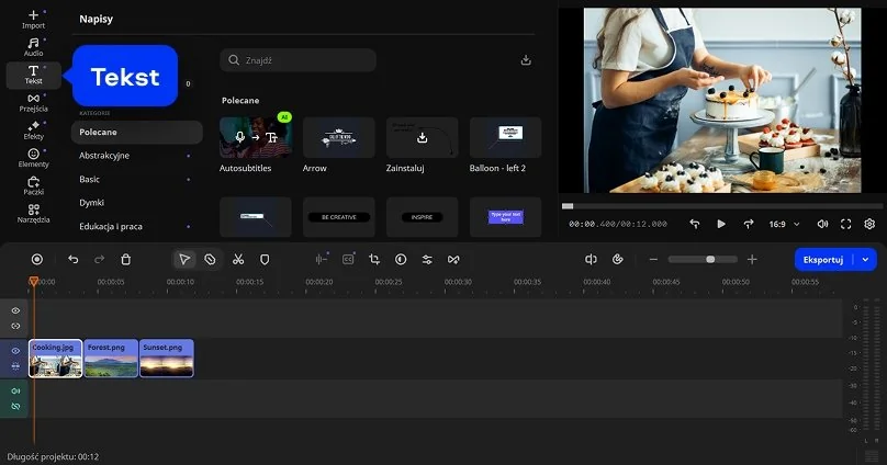 Kliknij Tekst, wybierz jedną z proponowanych opcji, przeciągnij i upuść ją na Ścieżka napisów. Edytuj tekst, kolor i czas trwania napisów. Gdy będziesz zadowolony z wyniku, kliknij Zastosuj.
