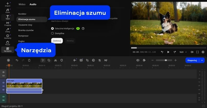 Aby uzyskać dostęp do funkcji usuwania szumów, kliknij Narzędzia. Otwórz opcję Audio i wybierz opcję Eliminacja szumu.