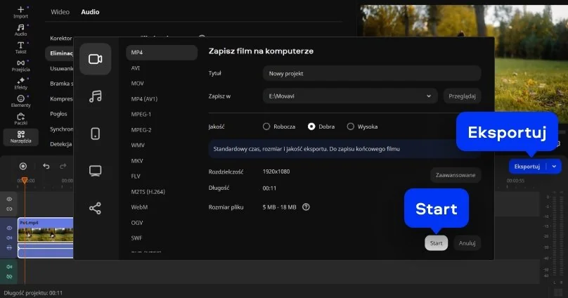 Pora zapisać swój poprawiony plik. Kliknij przycisk Eksportuj i wybierz format, w którym chcesz zapisać swój materiał filmowy. Możesz wybrać dowolny popularny format wideo lub audio: AVI, MP4, MOV, MP3, WAV, WMA itp. Gdy będziesz gotowy do zapisu, kliknij przycisk Start.