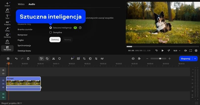 Aby automatycznie usunąć szum, kliknij Sztuczna inteligencja. Jeżeli chcesz usunąć szum ręcznie wybierz Domyślną. Aby wyeliminować niepożądane szumy z nagranego materiału, dostosuj suwak Tłumik szumów i kliknij przycisk Zastosuj. Eksperymentuj z różnymi ustawieniami suwaków, aż uzyskasz najlepsze rezultaty. Pamiętaj jednak, że wyższe poziomy tłumienia szumu mogą powodować zniekształcenia dźwięku.