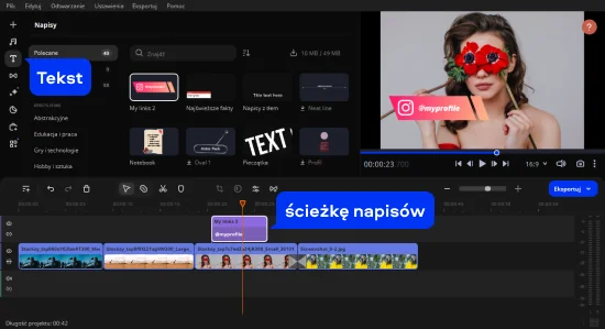 Wiesz już, jak stworzyć film ze zdjęć, ale możesz także dodać napisy do filmu, aby nadać obrazom pewien kontekst i pokazać, dlaczego są one dla Ciebie wyjątkowe. Otwórz kartę Tekst, wybierz styl napisów, którego chcesz użyć i przeciągnij go na ścieżkę napisów.