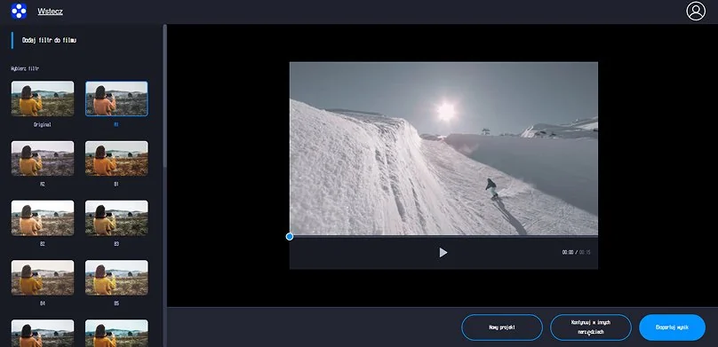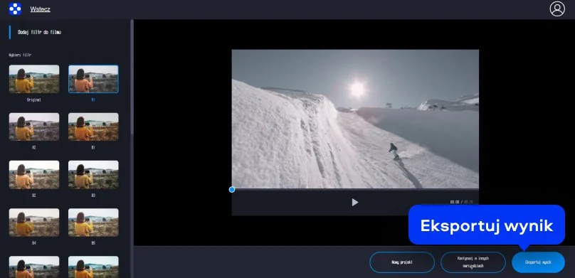 Na dole ekranu znajdziesz także przyciski, które pozwalają rozpocząć nowy projekt lub przejść do innych narzędzi, ale jeśli efekt Ci odpowiada, kliknij Eksportuj wynik. Narzędzie przetworzy materiał i przygotuje plik do zapisania. To rozwiązanie jest szczególnie wygodne wtedy, gdy chcesz szybko poprawić pojedyncze nagranie bez zagłębiania się w rozbudowany montaż. Taki edytor z filtrami do wideo sprawdzi się przy krótkich filmach na social media, materiałach prywatnych i codziennych klipach, które po lekkiej obróbce wyglądają po prostu lepiej.