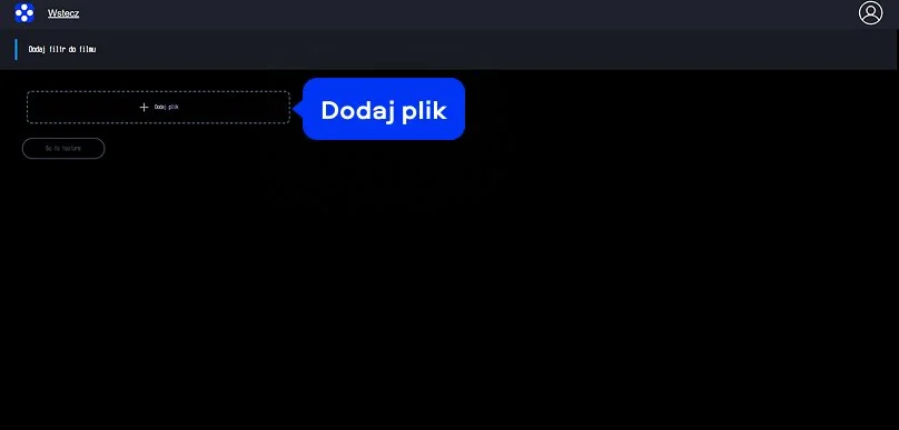 Po otwarciu strony zobaczysz ciemny interfejs z nagłówkiem Dodaj filtr do filmu oraz duży przycisk Dodaj plik w centralnej części ekranu. To od niego zaczyna się cała praca. Kliknij ten przycisk i wybierz film z komputera lub telefonu. Po wczytaniu materiału pojawi się możliwość przejścia dalej za pomocą przycisku Go to feature. Jeśli szukasz rozwiązania typu filtry wideo online, tutaj wszystko dzieje się intuicyjnie już od pierwszych sekund.