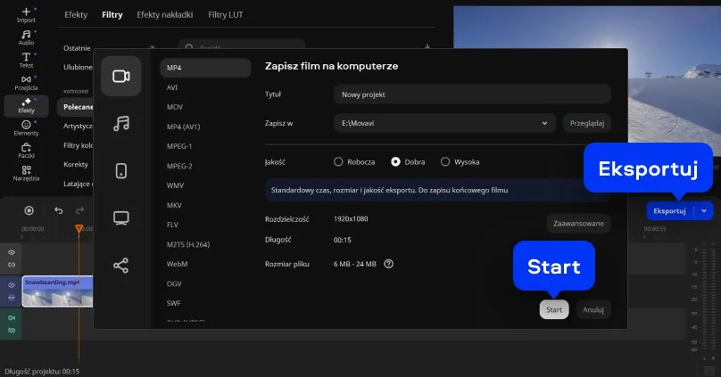 Jeśli chcesz zrobić coś więcej niż tylko szybko zmienić wygląd klipu, lepszym wyborem będzie Movavi Video Editor. To program desktopowy, który daje znacznie większą kontrolę nad materiałem, a jednocześnie nie odstrasza skomplikowanym interfejsem. Możesz w nim nie tylko dodać filtr, ale też przyciąć ujęcia, połączyć kilka scen, poprawić dźwięk, dodać napisy albo przejścia. Taka wersja pracy jest wygodna wtedy, gdy przygotowujesz film bardziej świadomie i zależy Ci na precyzji.