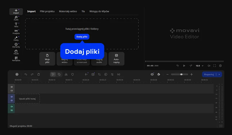 Uruchom Movavi Video Editor, kliknij Dodaj pliki i zaimportuj swoje wideo. Przeciągnij klip na Timeline, żeby był gotowy do edycji.