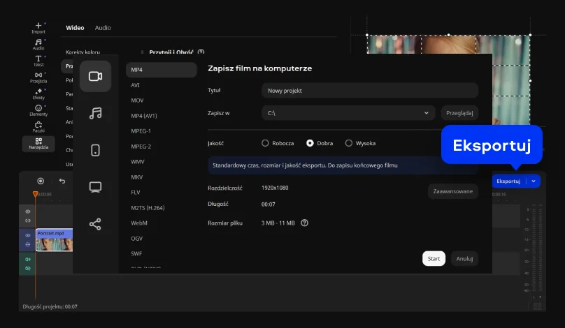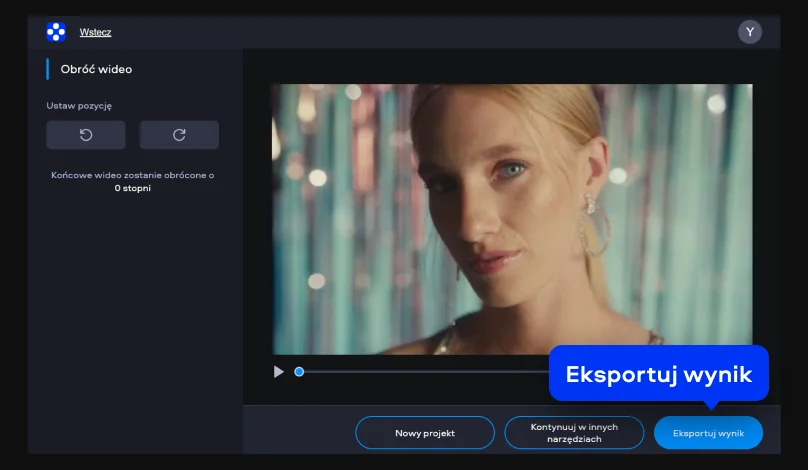 Gdy obraz wygląda już normalnie, kliknij Eksportuj, wybierz format i jakość, a potem zapisz plik. Obrócony film jest gotowy do dalszej edycji lub publikacji.