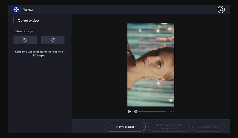 Użyj strzałek w menu po lewej stronie, aby obrócić wideo zgodnie z ruchem wskazówek zegara lub przeciwnie do ruchu wskazówek zegara, i obrócić film o 90°, 180° lub 270°. Podgląd na żywo pozwala szybko sprawdzić, czy obraz jest ustawiony dokładnie tak, jak chcesz.