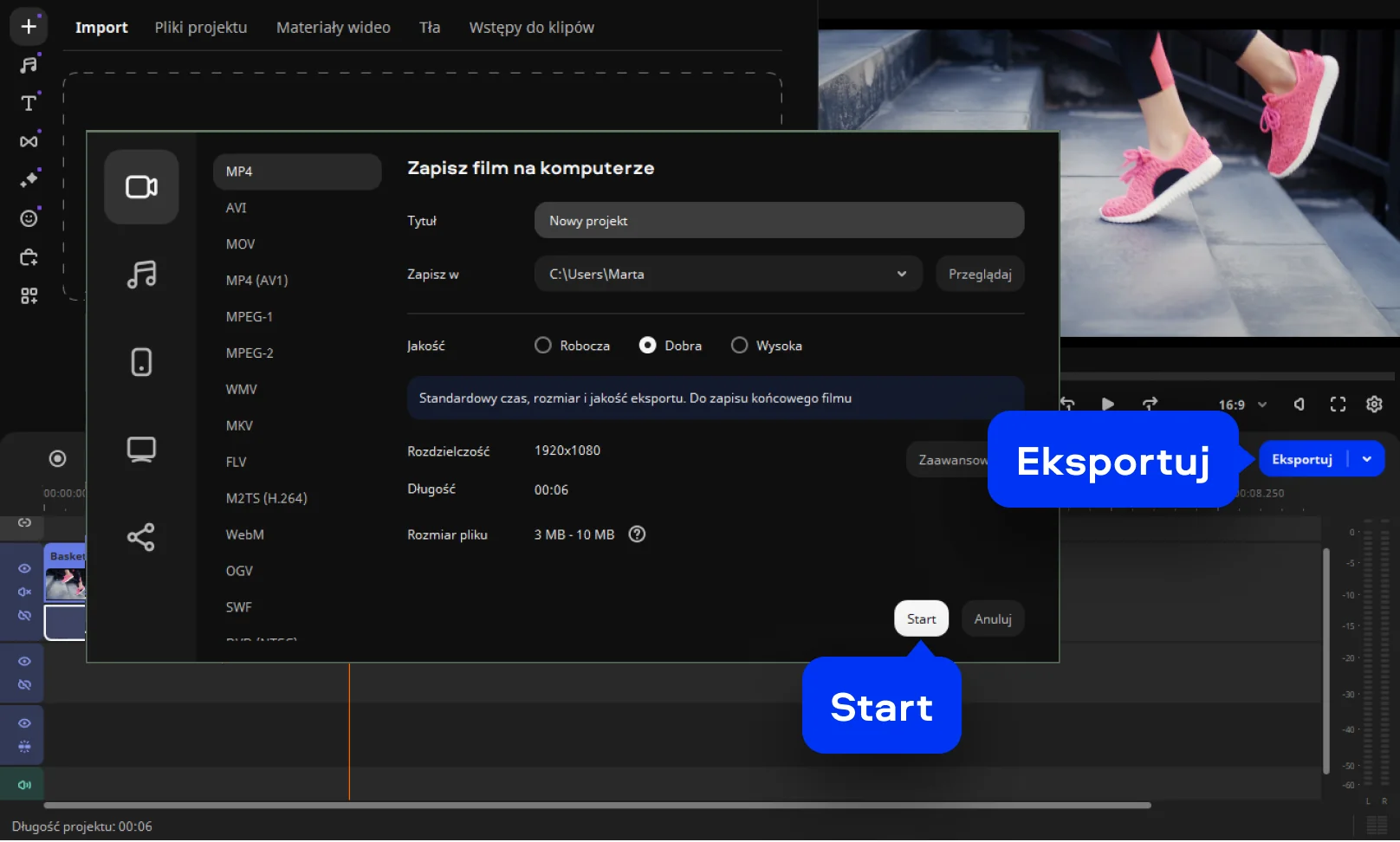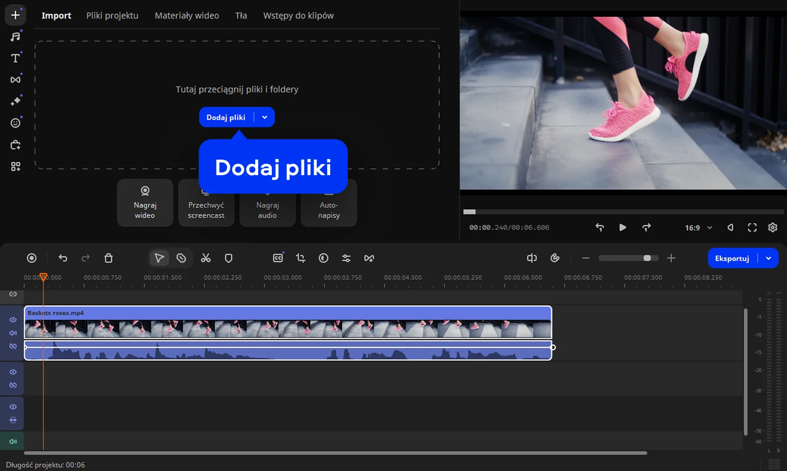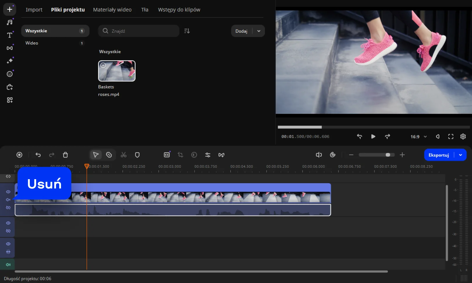 Gdy dźwięk zostanie usunięty, kliknij Eksportuj, wybierz format i lokalizację zapisu. W kilka sekund otrzymasz gotowy film bez dźwięku, gotowy do udostępnienia lub dalszej edycji.