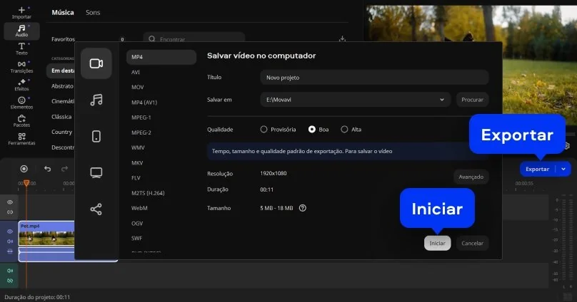 Clique em Exportar, escolha o formato desejado (como MP4, AVI ou MOV) e defina a qualidade do arquivo. Em seguida, salve o vídeo no computador ou compartilhe direto nas redes sociais.