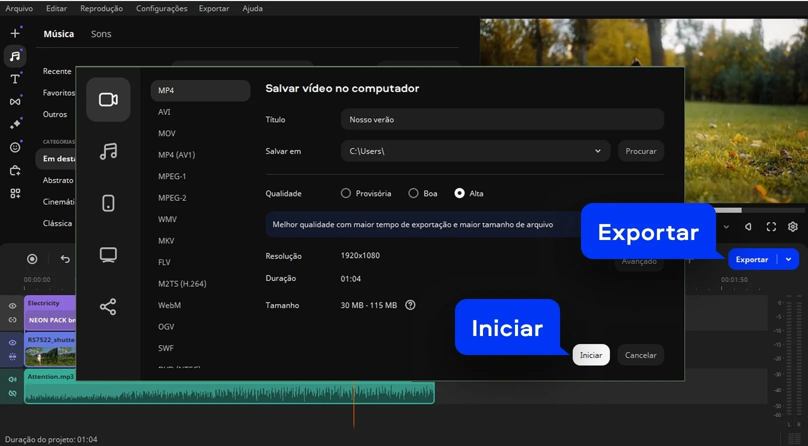 Revise o projeto e clique em Exportar. Escolha o formato e a qualidade desejados e salve. O Movavi Video Editor gera o arquivo final pronto para publicar ou guardar.