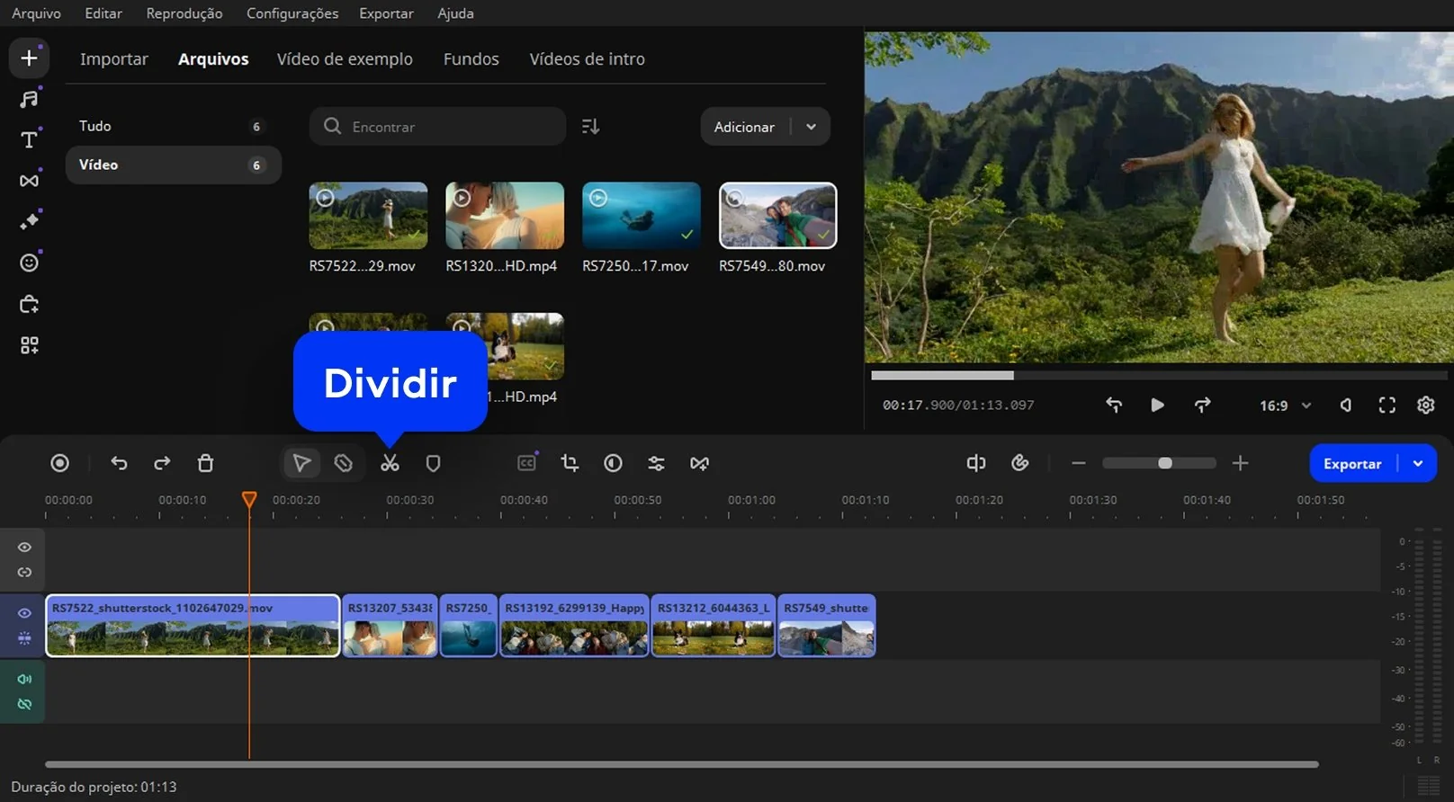 Selecione o clipe na linha do tempo e use as opções de Recortar e Dividir para eliminar o que não precisa. Ajuste a duração das partes importantes até que o ritmo do vídeo soe natural.
