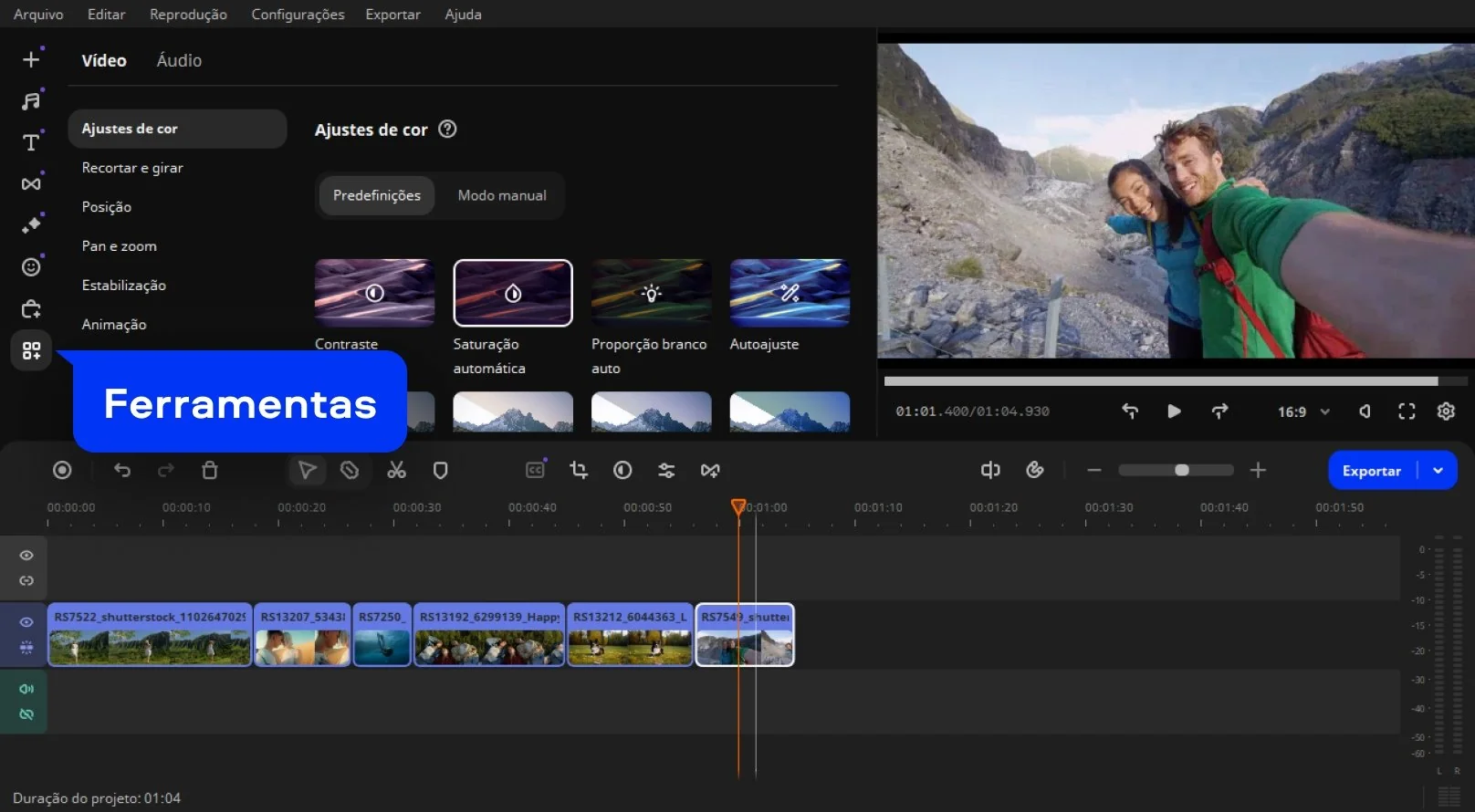 Ajuste cor, contraste e brilho para equilibrar a imagem. Em Ferramentas, reduza ruídos e deixe o som mais limpo. Pequenas correções fazem grande diferença no resultado final.
