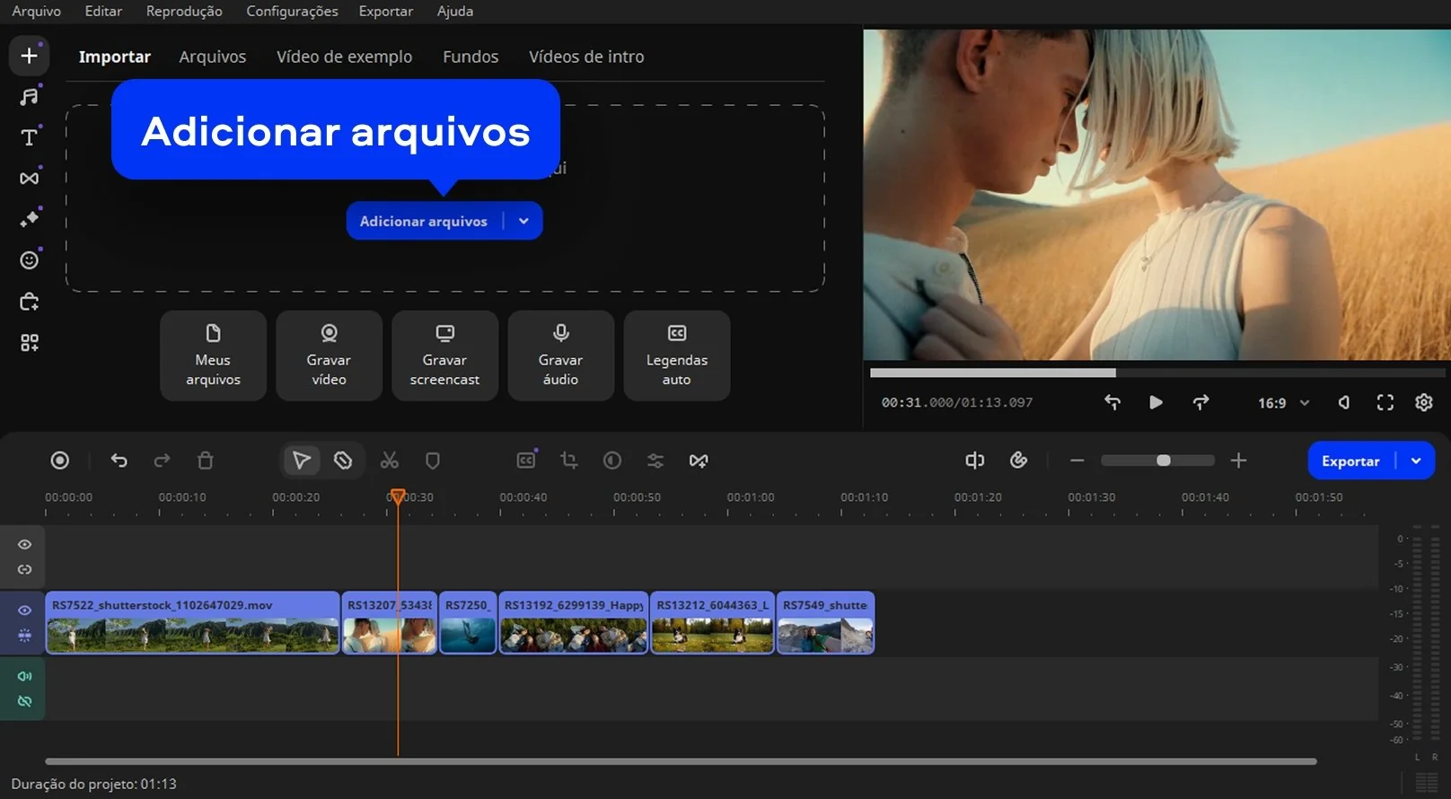 Abra o criador de filmes e clique em Adicionar arquivos. Escolha os vídeos e fotos que vai usar e arraste-os para a linha do tempo. Organize as cenas na sequência em que o filme deve acontecer.