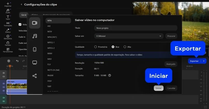 *A versão gratuita do Movavi Video Editor pode ter as seguintes restrições dependendo da versão: marca d'água nos clipes exportados, limite de 60 segundos para vídeo ou 1/2 para áudio e/ou alguns recursos avançados não disponíveis ao exportar vídeos.